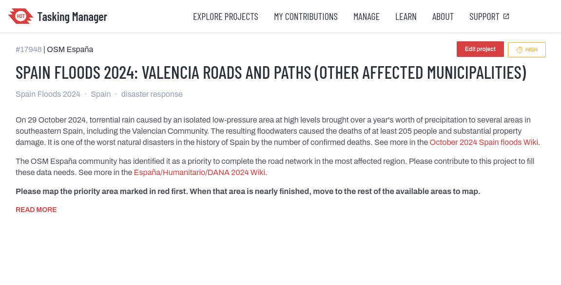 A causa de la emergencia generada por la DANA de Octubre 2024, especialmente en la Comunitat Valenciana y en Letur (Castilla La Mancha), la Comunidad de OpenStreetMap España ha decidido organizarse para realizar diversas tareas con el objetivo de ayudar a mapear toda la zona lo más rápida y efectivamente posible. Aquí se podrán encontrar todas las iniciativas a las que esta comunidad llama a participar activamente durante el tiempo que fuera necesario, también enlaces, etc.