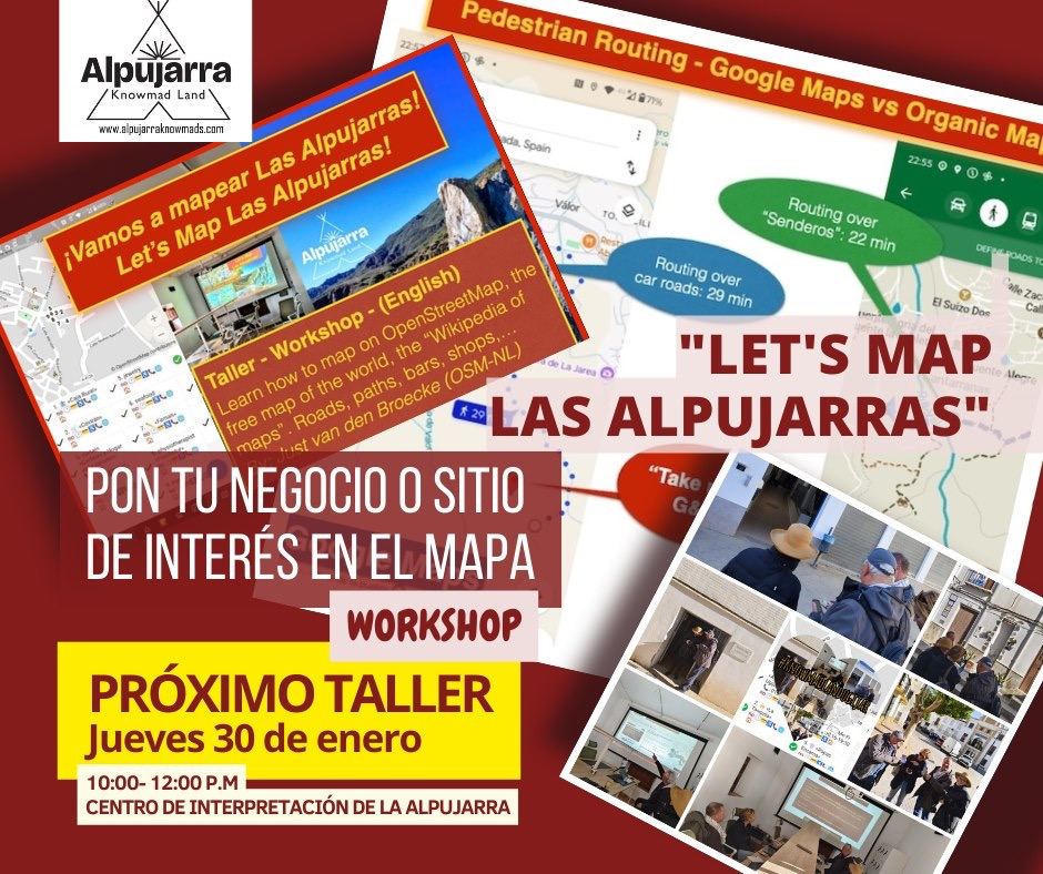 El próximo jueves 30 de enero, el Ayuntamiento de Ugíjar y KnowMadLand organizan el segundo taller “Vamos a mapear Las Alpujarras”. Si tienes un negocio o sitio de interés que quieres ver en el mapa, te invitamos a asistir al taller de 10:00 a 12:00 h.